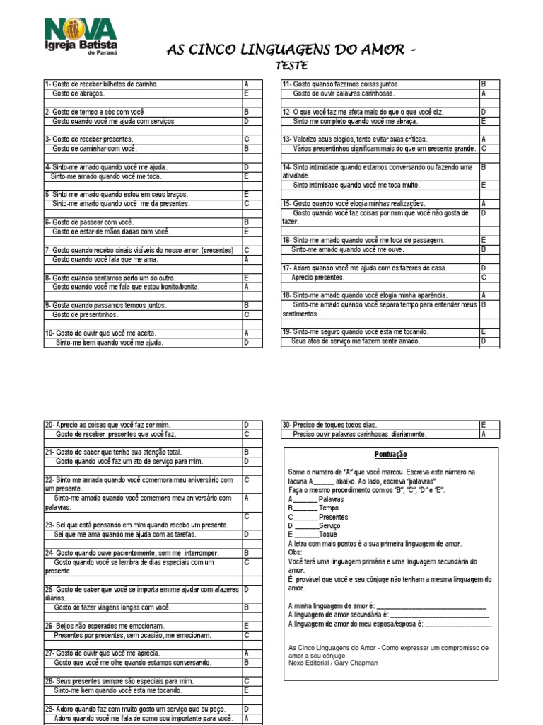 WebAS CINCO LINGUAGENS DO AMOR TESTE 1- Gosto de receber bilhetes de carinho. Gosto de abraços. A E 11- Gosto quando fazemos coisas juntos. Gosto de ouvir palavras. WebTESTE - AS CINCO LINGUAGENS DO AMOR. (Gary Chapman) Prepare o perfil quando estiver relaxado e sem pressão de tempo. Depois de fazer suas. escolhas, volte e conte. Web1. Grátis. Este Teste dos Estilos de Amor é entregue a você gratuitamente. 2. Controles estatísticos. A análise estatística do teste é conduzida para garantir a máxima precisão e. WebSe os totais de pontos para duas Linguagens de Amor (LA) forem os mesmo, você é “bilíngüe” e tem duas principais LA. Se tiver uma LA secundária, ou uma cujos. WebA linguagem é a capacidade que os seres humanos têm para produzir, desenvolver e compreender a língua e outras manifestações da comunicação. De. WebA linguagem do amor “Toque Físico” envolve o contato físico e a proximidade física para expressar e receber amor. Isso pode incluir abraços, beijos, carícias, segurar as mãos,. WebDownload Teste As 5 Linguagens Do Amor. Type: PDF. Date: November 2019. Size: 119.6KB. Author: MAURI TARCISIO PERKOWSKI. This document was uploaded by user. Webqual a sua linguagem do amor? Dentro de cada grupo, classifique as frases com números de 1 a 5 , de acordo com o que faria você se sentir mais amado e estimado por sua. WebEsta é sua Principal Linguagem de Amor (PLA). Se os totais de pontos para duas Linguagens de Amor (LA) forem os mesmo, você é “bilíngüe” e tem duas principais LA..